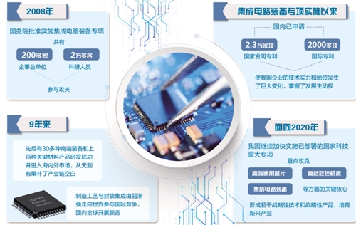 2008年,我国启动实施“极大规模集成电路制造装备及成套工艺”国家科技重大专项(简称集成电路装备专项)。9年来,集成电路高端制造装备和材料从无到有填补产业链空白,制造工艺与封装集成由弱渐强走向世界参与国际竞争,集成电路产业驶入了自主创新发展的快车道。