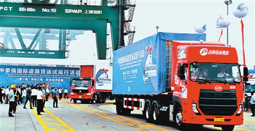 | 2013年以来,中国与“一带一路”沿线7个国家签署4个政府间双多边国际道路运输便利化协定,与沿线59个国家海关签署了94份通关便利化合作协议。图为2016年8月,中蒙俄国际道路货运试运行,中蒙俄三国车队从天津出发。 |