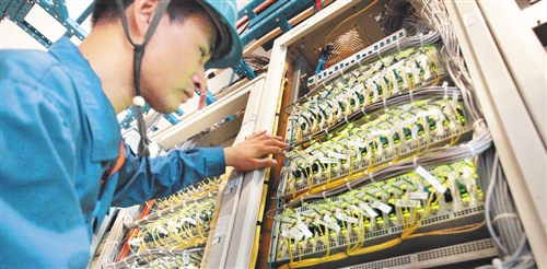 | 宽带网络是国家战略性公共基础设施,全国所有地市已基本建成“光网城市”,光纤网络广泛覆盖城乡,民众上网体验得到极大改善。图为技术人员在光纤信号收发器上为用户开通光纤信号电路。 |