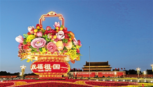 9月28日晚,北京天安门广场中心花坛“祝福祖国”巨型“花果篮”流光溢彩。 新华社记者 殷 刚摄
