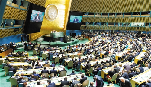 | ◀2015年9月26日,国家主席习近平在联合国发展峰会上发表题为《谋共同永续发展 做合作共赢伙伴》的重要讲话,全面阐述新发展观。图为2015年9月25日联合国发展峰会开幕式现场。 |