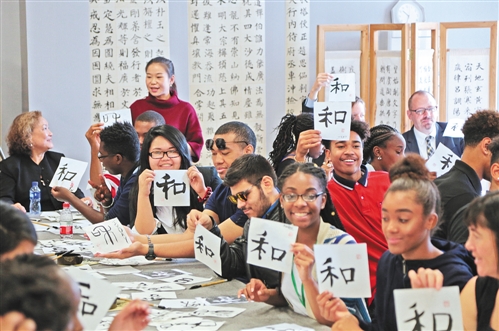| 国之交在于民相亲。图为美国林肯中学学生展示书法作品。 |