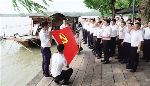 | ◀坚持高标准与守底线相统一,教育引导党员干部坚定理想信念,不断提高党性修养和政治觉悟;以党的纪律为尺子,强化刚性约束。图为浙江省嘉兴市党员干部在南湖红船前重温入党誓词。 |