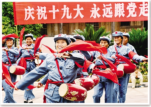 10月18日,党的十九大隆重开幕,在方志敏烈士故里江西弋阳县漆工镇湖塘村,身穿红军服装的农家大妈开心地打起腰鼓,喜庆盛会。