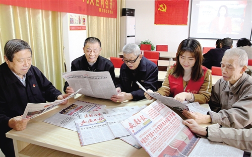 10月24日,安徽安庆市迎江区康熙河社区志愿者为辖区离退休党员和群众讲读党的十九大报告。江 胜摄