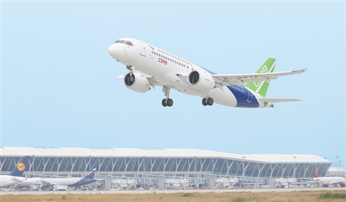 11月10日11时38分,我国自主研制的C919大型客机在上海浦东国际机场起飞,顺利完成首次城际飞行,成功转场至西安阎良,开展后续试飞工作。 新华社记者 丁 汀摄