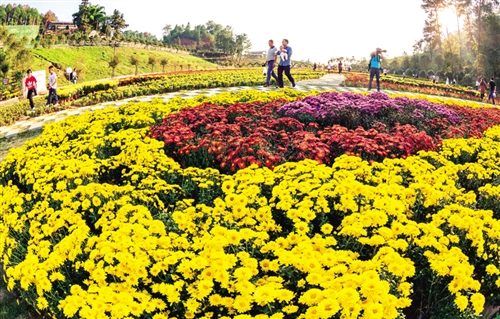 重庆市南川区是全国第三批资源枯竭型转型城市和重庆市14个石漠化综合治理重点区之一。近年来,南川区把推进转型发展和石漠化治理与山体植被恢复、土地整治、水资源恢复等相结合,大力发展立体生态农业、休闲农业,使关闭矿山和石漠化区域变成了景区、果园,城市周边森林覆盖率由37.1%提高到43.3%。图为11月10日,南川区慢谷森林花海里秋菊等鲜花绽放,游客漫步其中。 瞿明斌摄