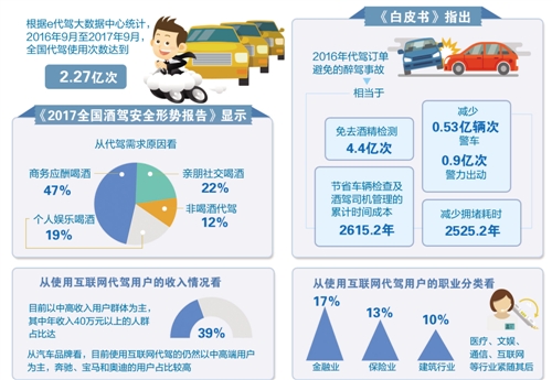 2.27亿次的代驾使用直接降低了交通事故发生比例。据《2017全国酒驾形势报告》显示,根据过去5年全国平均酒驾交通事故发生比例以及伤亡人数比率计算,过去一年因为代驾,避免了超过300万起因酒驾导致的交通事故,间接挽救了数十万人的生命,避免因酒驾造成直接经济损失超过百亿元。