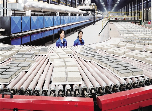 11月30日,在江西高安市建筑陶瓷产业基地,绿岛科技公司员工正在城市透水砖生产线上检查生产。该企业生产原料全部是陶瓷企业的陶瓷废砖,年处理废瓷砖20多万吨。