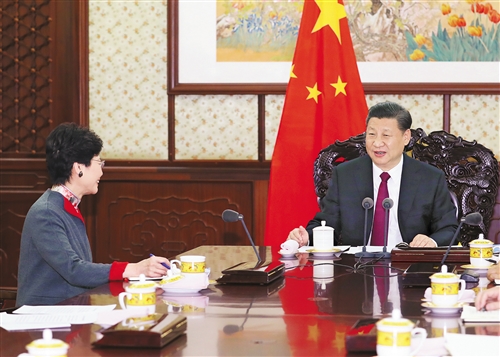 习近平指出,中共十九大召开后,行政长官带领特别行政区政府管治团队及时学习领会大会精神,邀请和配合中央宣讲团到香港开展宣讲活动,这些做法都很好。中共十九大把“坚持‘一国两制’和推进祖国统一”确定为新时代坚持和发展中国特色社会主义基本方略的重要内容,意义重大。