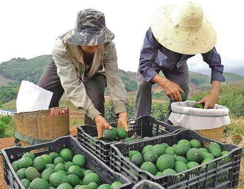 普洱市孟连傣族拉祜族佤族自治县芒信镇芒信村村民正在收获牛油果。孟连县通过7年的培育,现已建成7500亩牛油果示范园。根据规划,到2025年牛油果种植面积将扩大到10万亩。 刘少华摄 |
