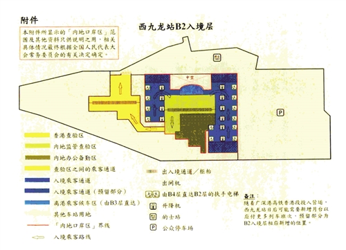 第二条 内地口岸区的范围为西九龙站地下二、三层的划定区域、地下四层月台区域及有关连接通道,包括内地监管查验区、办公备勤区、离港乘客候车区、车站月台和连接通道及电梯。内地口岸区范围的详情见附件。