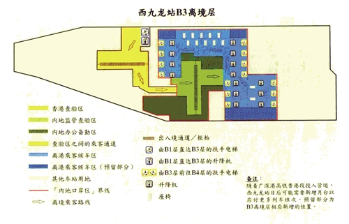 西九龙站口岸分为香港口岸区和内地口岸区。香港口岸区由香港特区依据特区法律设立和管辖,实行过境限制区管理。内地口岸区由内地根据本合作安排和内地法律设立和管辖,实行口岸管理制度。