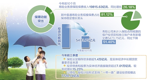 事实上,“保险业姓保”可以看成是2017年保险业防风险的重要手段之一。以“保险业姓保”来回归保障本义,抑制了保险公司在资本市场争相举牌的冲动,倒逼行业调整结构,从营运方式到产品设计,从轻保障、重投资转向重保障进而是长期保障。这种变化也可以从前10个月的数据中看到。前10个月,寿险业务原保险保费收入19815.63亿元,同比增长26.18%,其中人身险公司业务中具有长期稳健风险管理和保障功能的普通寿险业务,规模保费占比81.12%,保持稳定增长势头。寿险公司未计入保险合同核算的保户投资款和独立账户本年新增交费5473.75亿元,同比下降51.40%。