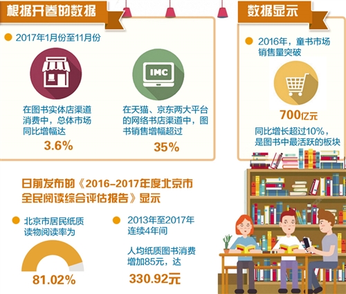 根据开卷的数据,2017年1月份至11月份,在图书实体店渠道消费中,总体市场同比增幅达3.6%;在天猫、京东两大平台的网络书店渠道中,图书销售增幅超过35%。同时,日前发布的《2016-2017年度北京市全民阅读综合评估报告》显示,北京市居民纸质读物阅读率为81.02%;2013年至2017年连续4年间,人均纸质图书消费增加85元,达330.92元。这一系列数字无不说明,纸质书不仅没有在与电子书的“短兵相接”中败下阵来,反而实现了逆势上扬。