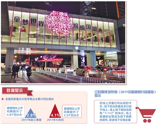 数据显示,2017年前三季度,全国百家重点大型零售企业累计同比增长2.8%,增速相比上年同期提升了4.8个百分点;2017年10月份,全国百家重点大型零售企业同比增长4.1%,增速相比上年同期提升了4.3个百分点。消费持续回暖,越来越多的顾客选择在岁末年初“买买买”,犒赏自己和家人一年的辛勤劳动。