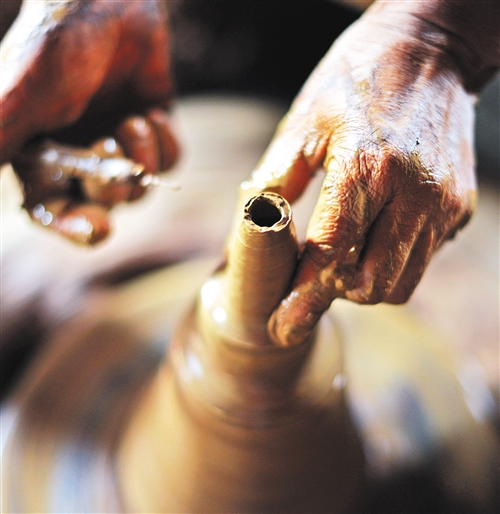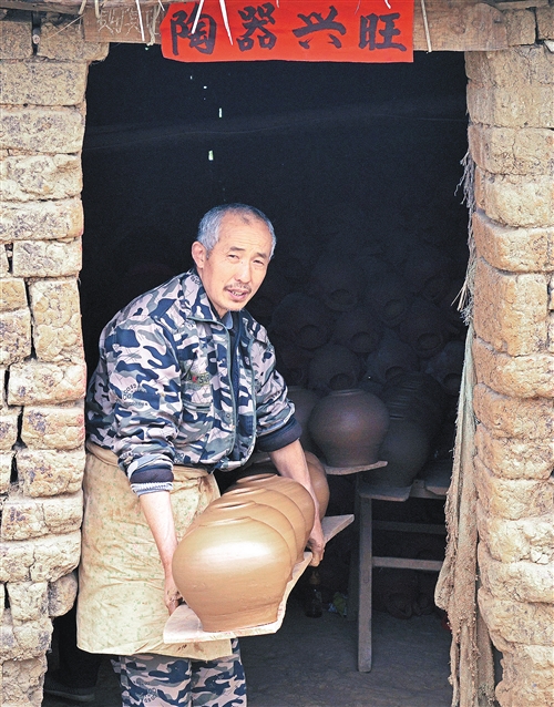 胡光荣和他的土窑颇有些旧时隐者的风范,窑棚用渣块土壁一分为二,一边是操作间,另一边则是小库房。操作间是主要的工作场所,用以盘泥、拉坯、晾坯。墙角一边散堆着自山间取来的泥土,这些泥土经过耙细、筛渣、润湿,然后在另一边的工作台上反复揉捏,直至泥土细润柔滑后才能用于拉坯。窑炉就在门首正对面,那是一座传统的“通风扯火窑”。窑炉为陀螺状,下大上小,取窑口在炉顶,揭开铺设其上的油毡布,探头看去,一窑烧好的土茶壶挤挤挨挨在圆鼓状的窑腔里排放着,待冷却后,便用长长的钩杆,将它们一一钩出窑炉。 郑 毅图/文