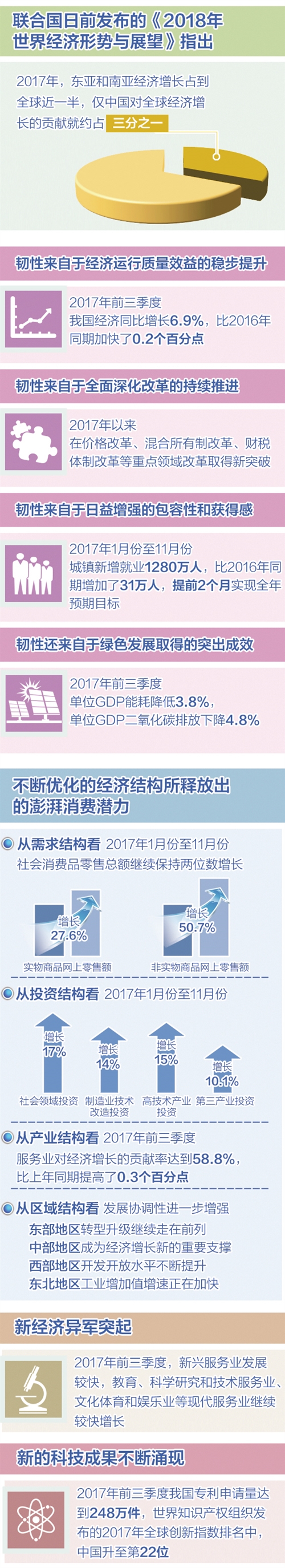 2017年,在以习近平同志为核心的党中央坚强领导下,我国经济发展的活力韧性持续增强,回旋余地更加广阔,各类市场主体活力进一步增强、新经济发展迅猛、新动能加快形成、区域协调发展快速推进。展望未来,中国经济增长速度将保持稳定——