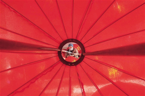 | ▲1月3日,山西运城市稷山县杨赵村灯笼产业园员工在制作灯笼。高新生摄 |