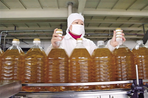 | ▼1月7日,山东博兴县山东渤海实业股份有限公司灌装车间,员工在包装食用油。陈 彬摄 |