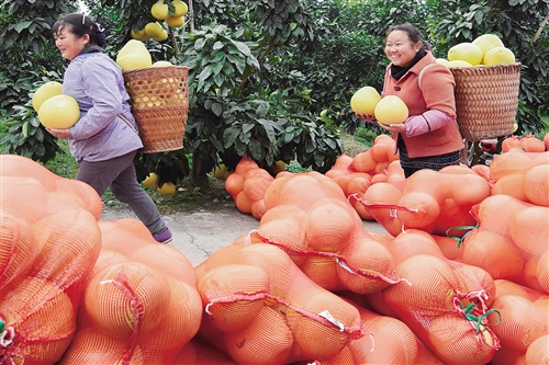 | ▼1月4日,贵州铜仁市松桃苗族自治县太平营街道红肉蜜柚基地,果农在采收蜜柚,供应市场。 龙元彬摄 |