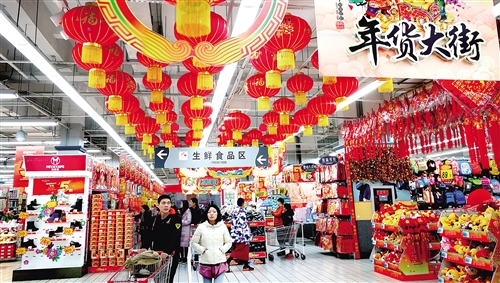 1月16日,随着春节的临近,江苏如皋市城区一家大型商场内,2018盏大红灯笼把年货大街装扮得熠熠生辉、年味浓浓。喜庆热闹的氛围、琳琅满目的商品吸引了广大市民前来采购年货。