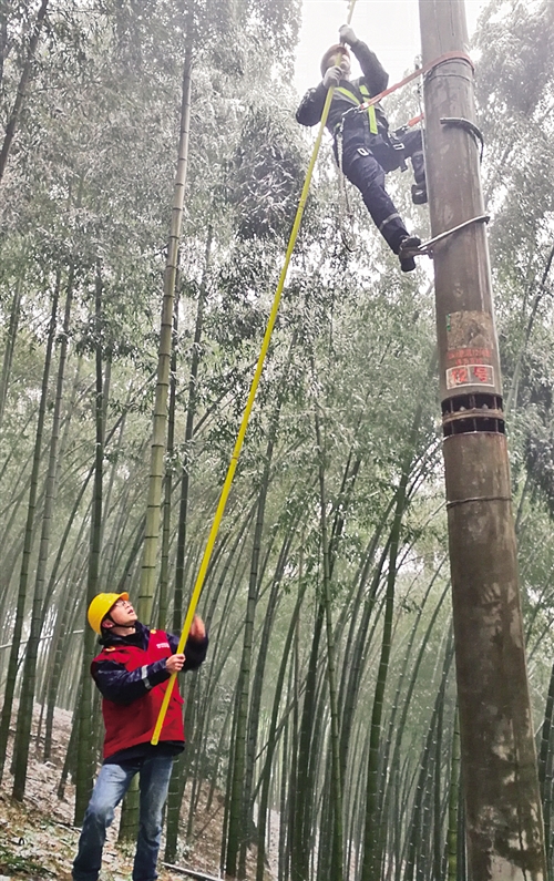 本报讯 记者刘麟报道:1月25日,湖南省邵阳市城步苗族自治县南山海拔1600米的10千伏南长线特巡抗冰保供电现场,线路平均覆冰厚度达4毫米,电力工人张勇带领队员们已连续9小时奋战在高寒山区巡线除冰。受气温持续下降和连续雨雪冰冻天气影响,邵阳迎来最强寒潮,冻雨、雨夹雪天气考验着邵阳电网,国网邵阳供电公司派出113支共产党员服务队奔赴一线,保障电网安稳运行。