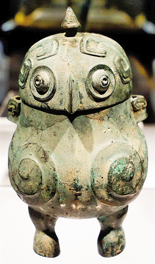 鸮(音xiāo),即猫头鹰,商代人崇拜的图腾之一。猫头鹰特殊外表和独有的生活习性在商代人眼中充满神秘感,久而久之转化成一种神圣的宗教情感,猫头鹰被商代人推崇成为神鸟,成为商代人膜拜的对象之一。因此,鸮成了商代的青铜器的样子。