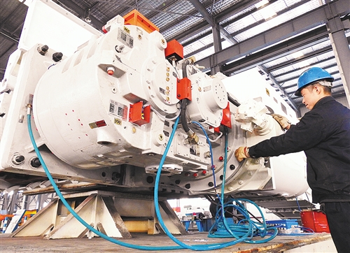 1月28日,位于江苏连云港市海州区的天明机械集团有限公司,工人在调试8.8米智能大采高工作面刮板输送机成套设备。当日,世界首台套8.8米智能大采高工作面刮板输送机成套设备在天明机械集团下线。经专家现场评议,该产品可满足大型煤矿厚煤层、大采高、高产高效集约化、智能化综采生产的要求。耿玉和摄