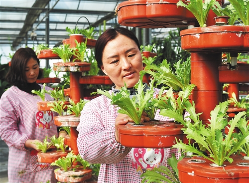 江苏东海县高新农业园区就业农民工在管理高端蔬菜。近年来,东海县引进国外高新科技良种、液肥水动无土栽培与无公害化有机管理的模式,强力推广环保立体种植、立柱型种植、墙壁型种植、空中种植与管道栽培等多种模式无土蔬菜栽培方法,较快提升了市场竞争力,成为农民增收致富的重要途径。张 玲摄