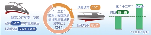 一项针对各地“十三五”时期城轨交通发展规划的调研表明:规划建设轨道交通的城市达到124个,其中续建城市41个,新进城市83个,这一数字将比“十二五”时期翻一番;按里程看,“十三五”时期城轨新建运营线路或将超过过去50年来建成投运的总里程之和。