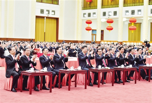 人民大会堂宴会厅灯火辉煌、暖意融融,各界人士2000多人欢聚一堂、共迎新春,欢声笑语间洋溢着喜庆祥和的节日气氛。