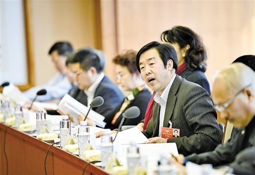 右图 3月13日,全国政协十三届一次会议举行小组会议,讨论监察法草案、国务院机构改革方案。全国政协委员于革胜(右二)表示深化机构改革很有必要。
