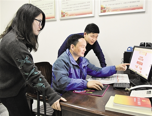 下图 3月14日,安徽省定远县池河镇的干部在查看国家机构改革的相关新闻报道。冯再雷摄