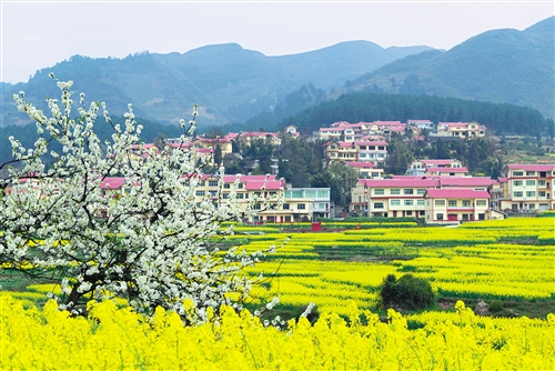 3月19日,贵州仁怀市高大坪镇银水村,竞相盛开的油菜花、李花与远处的农舍构成了一幅美丽的农家春景。 陈 勇摄