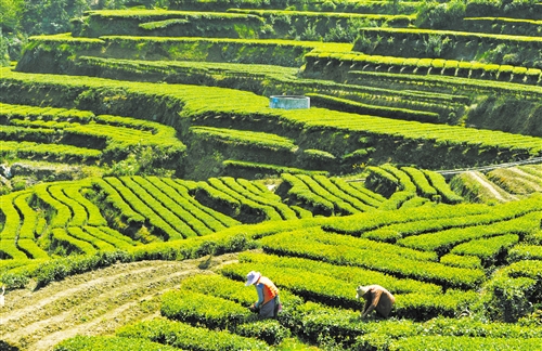 4月7日,茶农在三峡库区湖北省秭归县茅坪镇长岭村的茶园里采摘茶叶。近来,该县的茶叶进入采摘高峰期,当地茶农抢抓晴好天气及时采摘,以供应各地市场。