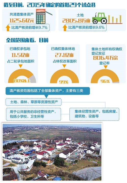 从2017年起,原农业部会同有关部门全面启动清产核资工作。全国层面已经分两批共选择129个县开展了农村集体产权制度改革试点,一些省份也自行选择部分县和村进行了试点。截至目前,2015年确定的首批29个试点县共清查集体资产1125.6亿元、土地2805.8万亩,比清产核资前分别增长9.7%和9.6%。全国范围来看,目前已确权承包地11.5亿亩,占二轮承包地面积80%以上;已确权集体林地27.1亿亩,占林权改革面积99%;集体土地所有权确权登记发证806.4万宗,登记率96%。