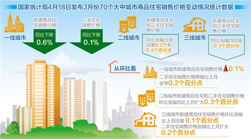 国家统计局城市司高级统计师刘建伟分析称,3月份,各地继续以因地制宜、因城施策的房地产政策为主基调,坚持分类调控,保持政策的稳定性和连续性。一线城市新建商品住宅销售价格同比下降0.6%,降幅比上月扩大0.5个百分点;二手住宅销售价格本月首次出现下降,降幅为0.1%。二线城市新建商品住宅和二手住宅销售价格同比涨幅分别比上月回落0.2个和0.4个百分点。三线城市新建商品住宅和二手住宅销售价格同比涨幅均比上月回落0.3个百分点。