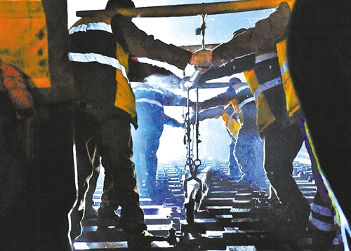 下图 北京铁路集团公司工人冒雨更换新组道岔入位。吴晓强摄