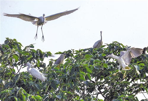 5月2日,安徽省庐江县乐桥镇鹭岛景色美丽,成千上万只白鹭等鸟儿不时地舞动翅膀嬉戏。近年来,庐江县对鹭岛所在的乐桥镇大堰塘加大投入进行改造,使得原先的“臭水塘”摇身一变成了水清树绿的“大水缸”,引来数以万计的白鹭、灰鹤等候鸟筑巢、繁殖。