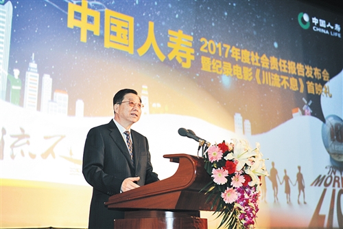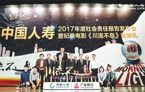 2018年5月8日,中国人寿举行《2017年度企业社会责任报告》发布会暨纪录电影《川流不息》首映礼活动,会上发布了中国人寿一年来履行社会责任、参与社会治理、助力实体经济、服务公益事业等方面开展的工作及相关数据。作为中国金融保险行业领跑者,中国人寿已经连续15年入选《财富》杂志“世界500强”,2017年位列第51位;连续11年入选“世界品牌500强”。特别是在2016年入主广发银行后,中国人寿已经形成了保险、投资、银行的综合金融保险新格局。2017年,品牌价值高达人民币2871.56亿元,软实力与硬实力双线并进,不断升级。