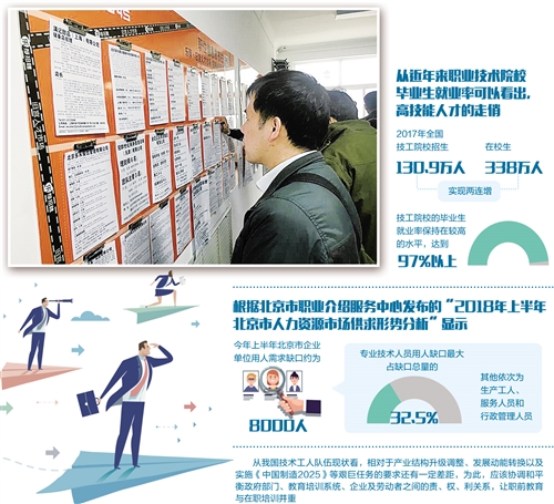 专家指出,从我国技术工人队伍现状看,相对于产业结构升级调整、发展动能转换以及实施《中国制造2025》等艰巨任务的要求还有一定差距。为此,应该协调和平衡政府部门、教育培训系统、企业及劳动者之间的责、权、利关系,让职前教育与在职培训并重,通过重视企业内部员工的培训,借助职业学校,延伸培养人才链,培育企业急需的合格人才。