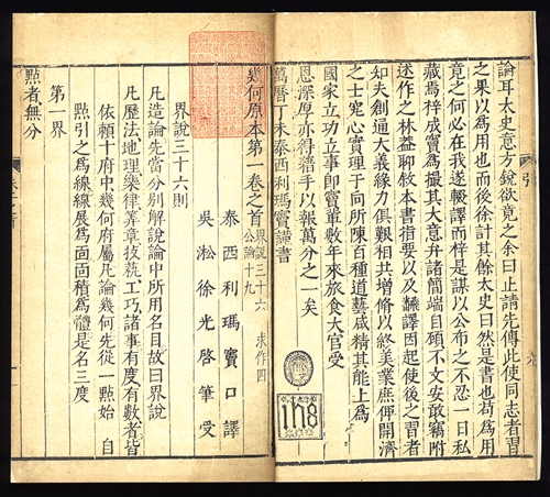 明神宗万历十年(1582),意大利传教士利玛窦到中国传教,“负西国异书”,即带来了十五卷的《几何原本》。利氏“以数载习语认字,数载通经学文”,终而“融会两境义理,有所阐译”。万历二十八年(1600),利玛窦进京贡献,得以“侨邸燕台”;四年后,徐光启赴京会试,考选为翰林院庶吉士。两人相识后渐有来往,徐光启常去利玛窦寓所谈论“天主大道”,利玛窦以徐光启“既自精心,长于文笔,与旅人辈交游颇久”,“私计得与对译,成书不难”,故而认定徐光启为翻译《几何原本》的合适人选。之后,利玛窦口传,徐光启笔授,二人“反复辗转,求合本书之意,以中夏之文重复订正,凡三易稿。迄万历三十五年(1607)春,前六卷译毕刊刻”并改名为《几何原本》。后九卷则是到了1857年由中国清代数学家李善兰(1811-1882)和英国人伟烈亚力译完的。