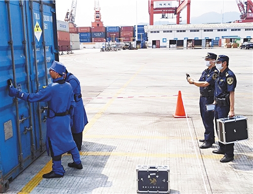 图为海关关员对放射性超标进口废铜实行铅封并作退运处置。 本报记者 顾 阳摄