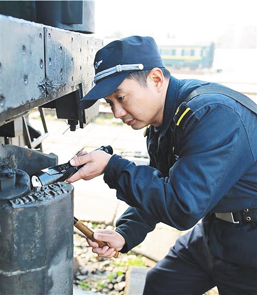 “砰砰、砰砰……”华灯初上的中国铁路武汉局集团有限公司武昌客车车辆段客车整备库里,一名身着蓝色工装的工作人员正在一辆辆客车下不停地钻进钻出,借助手电筒的光亮,小小的检车锤轻敲轮轴、螺栓、弹簧等重要部件,一阵阵铿锵有力又不乏节奏的敲击声显得格外响亮。