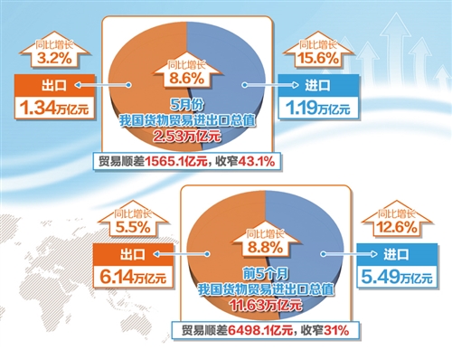 今年前5个月,我国货物贸易进出口总值11.63万亿元,同比增长8.8%。其中,出口6.14万亿元,增长5.5%;进口5.49万亿元,增长12.6%;贸易顺差6498.1亿元,收窄31%。