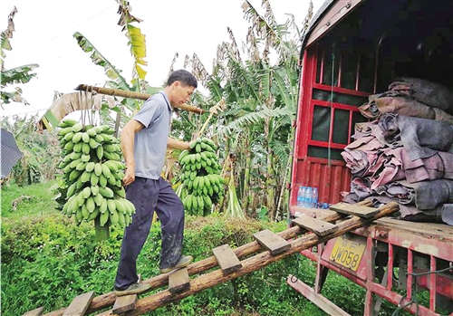 5月9日,广西兴业县大平山镇南村的800亩粉蕉种植基地里一派繁忙景象,蕉农们从树上砍下个头饱满的粉蕉,扁担两头沉甸甸地各挑一把,脚步敏捷地顺着梯子将粉蕉担上货车。不多时,一辆辆满载粉蕉的大货车就出发了……
