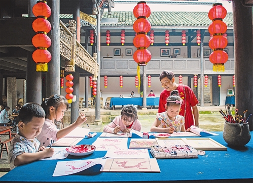 6月22日,学生在重庆市綦江区东溪镇南华宫体验版画制作。近年来,綦江区开设极具浓郁地方特色的綦江农民版画体验式课堂,让游客体验綦江农民版画的制作过程,宣扬和传承非遗文化。陈星宇摄