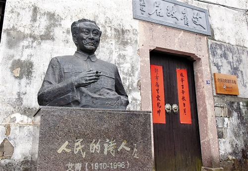 在《大堰河—我的保姆》一诗中,艾青说“我是地主的儿子”。他的确出身望门,眼前的“艾青故居”是一座坐北朝南、五开两厢的楼屋,有着江南水乡特有的白墙黛瓦建筑风格。中央天井宽敞明亮。穿过中堂,进入艾青父母的卧室,里面摆着“红漆雕花的家具”和有着“金色的花纹”的睡床,都是诗人在《大堰河——我的保姆》一诗中提到过的。