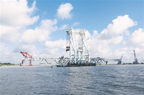 6月29日,中国建造的万吨级中心架梁起重船“天一号”在孟加拉国的帕德玛大桥施工现场作业。 由中铁大桥局集团有限公司承建的孟加拉国帕德玛大桥项目26日取得重要进展,万吨级中心架梁起重船“天一号”成功将重达3200吨的第五跨钢梁架设到桥墩上。帕德玛大桥的建成将结束孟加拉国南部21个区与首都达卡之间居民摆渡往来的历史。帕德玛大桥将是连接中国及“泛亚铁路”的重要通道之一。 新华社发